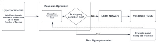 Recurrent Neural Networks (RNNs) have been shown to be propitious in the analysis of both single data points and sequential data, such as acoustic inputs. A feedback loop connects the input of RNN to its output, allowing them to model the dependencies in time series. Long Short-Term Memory (LSTM) networks are a type of RNNs with memory cells capable of learning, keeping, and forgetting data. By means of this memory cell, LSTMs function well with both short-term and long-term features [74]. Since the generation of the cry signal is intrinsically dynamic, RNNs may prove functional in their acoustic modeling. However, the challenge arises from the complexity of the training and tuning of hyperparameters of these networks. In order to overcome this challenge, the HPO methods were implemented to find and choose the optimal HPs. As mentioned above, Bayesian optimization requires fewer iterations than the grid search method to achieve the optimal values for the HPs in neural networks. The general task of HP acquisition by the BHPO is depicted in Figure 3.