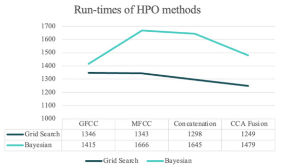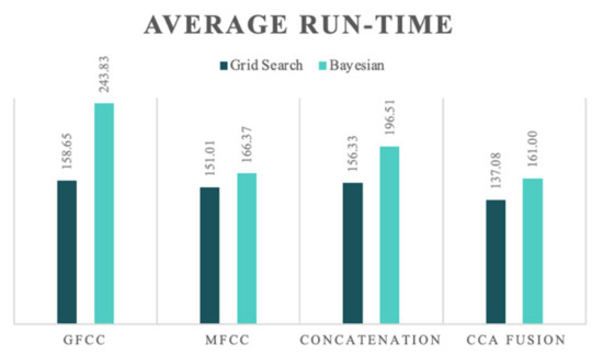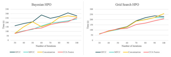 In the previous section, the evaluation results regarding each feature set and classifier combination were extensively discussed; now, the discussion is undertaken from the perspective of the computational cost. For this matter, the run-time was selected as an indicator. It should be noted that in the case of the joint feature sets, namely, concatenation and CCA fusion, the given run-times include the process of concatenation and fusion, and not only the time corresponding to the HPO process. The elapsed times for the extraction of the GFCC and MFCC feature sets were 558.31 and 836.16 s, respectively, which suggests the GFCC feature set requires lower computational costs; other researchers have also mentioned the same results [66]. Figure 4 compares the run-times of the grid search HPO and BHPO methods for different iterations of each one when applied to the SVM classifier.