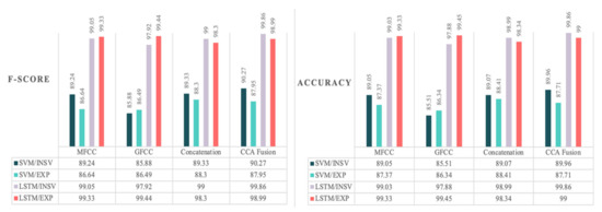 Table 12 constitutes the results of the next experiment with the LSTM classifier. The system’s performance was better than the concatenation framework since the CCA fusion removes the redundant features and helps improve the uniformity of feature space. This experiment showed the best performance in assessing the INSV dataset among all the previous experiments for all of the evaluation measures, specifically reaching 99.86% for both F-score and accuracy and 1.00 for the MCC measure. As for the EXP dataset, the GFCC feature set outperformed both combinational feature sets in terms of all evaluation measures.