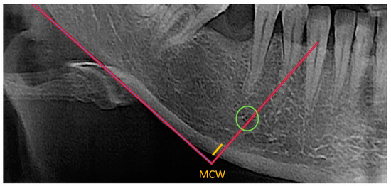 Evaluation of the thickness (yellow line) of the cortical bone at the lower border of the mandible (MCW index) below and distally of the mental foramen (green circle).