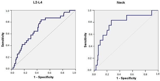 ROC analysis of MCW with T-score in the lumbar spine and femoral neck.