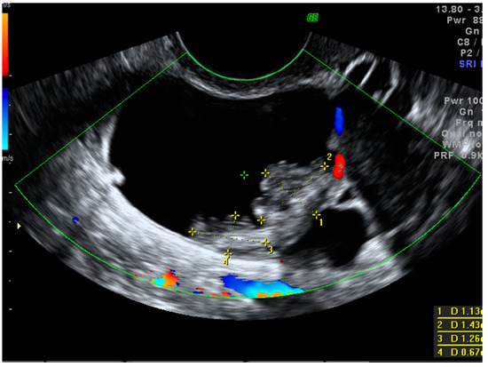 A standardized examination protocol of transvaginal ultrasonographic examination (supplemented with a transabdominal scan, if necessary) was performed by level II or level III examiners in all cases [27,28]. Using the IOTA terminology, we searched for pelvic tumor features that were, or could have been, related to the increased risk of malignancy. Such features included tumor type (unilocular, multilocular, unilocular-solid, multilocular-solid and solid), cyst echogenicity (anechoic, hypoechoic, ground-glass echogenicity, hyperechoic or not applicable in solid lesions), tumor size (<40 mm, 40–100 mm, >100 mm), an ovarian crescent sign and acoustic shadows. When papillary projections equal to or higher than 3 mm were found within the cystic mass, their number, vascularity, contour and the presence of the microcystic pattern were also evaluated [28]. If present, the largest solid component other than a papillary projection was also measured (Figure 2).