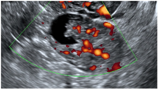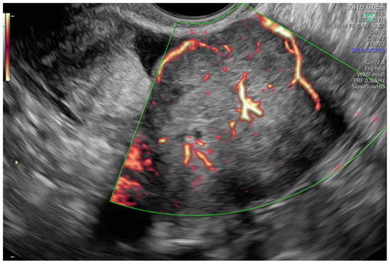 This was a multicenter retrospective study that included women who were operated on because of complex morphology adnexal tumors. The study was carried out in two departments of obstetrics and gynecology (Department of Obstetrics and Gynecology at the Fryderyk Chopin University Hospital No 1 and Department of Obstetrics and Gynecology of the ProFamilia Hospital, Rzeszow, Poland) and one Gynecological Oncology Center (Department of Gynecological Oncology and Gynecology of the Medical University of Lublin, Poland) between January 2012 and December 2020. High-end ultrasound equipment was used for the purpose of this study: GE Voluson E8 and E10 (GE Healthcare, Zipf, Austria) or Samsung WS80A Elite and Hera W10 (Samsung, Seoul, Korea). The frequencies of the vaginal probes varied between 5.0 and 9.0 MHz and those of the abdominal probes between 3.5 and 5.0 MHz. Patients were eligible for this study if they were aged 18 years or older at recruitment and had at least 1 complex morphology adnexal mass (ovarian, paraovarian or tubal) detected on ultrasonographic examination. Complex adnexal mass was defined as a non-unilocular cyst or a cystic–solid lesion with non-uniform echogenicity (Figure 1).