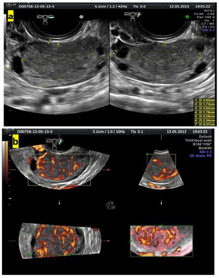 - Timmerman, D.; Valentin, L.; Bourne, T.H.; Collins, W.P.; Verrelst, H.; Vergote, I.; International Ovarian Tumor Analysis (IOTA) Group. Terms, definitions and measurements to describe the sonographic features of adnexal tumors: A consensus opinion from the International Ovarian Tumor Analysis (IOTA) group. Ultrasound Obstet. Gynecol. 2000, 16, 500–505. [Google Scholar] [CrossRef]