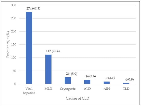 A total of 441 patients were included in our study, with the majority being elderly. The mean age of patients was 57.9 (SD12.1) years old. Most of the patients were male (65.1%), Malays (92.1%), and had a history of transfusion (54.9%). The most common causes of CLD in our center were due to viral hepatitis (62.1%), followed by metabolic liver disease (25.4%), cryptogenic liver disease (5.9%), and other causes, as shown in Figure 1. The details of descriptive data are illustrated in Table 1.
