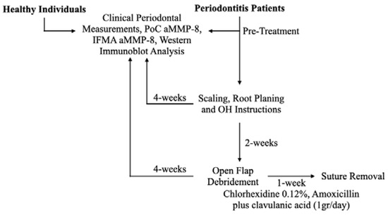 - Hernández, M.; Gamonal, J.; Tervahartiala, T.; Mäntylä, P.; Rivera, O.; Dezerega, A.; Dutzan, N.; Sorsa, T. Associations between matrix metalloproteinase-8 and -14 and myeloperoxidase in gingival crevicular fluid from subjects with progressive chronic periodontitis: A longitudinal study. J. Periodontol. 2010, 81, 1644–1652. [Google Scholar] [CrossRef]