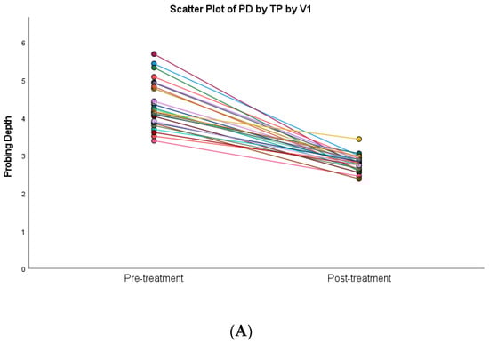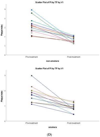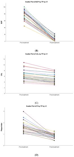 Differences in periodontal clinical parameters at baseline and 1 month after anti-infective periodontal treatment. The linear regression line is shown in different colors for each subject: (A) PD = probing depth; (B) BOP = bleeding on probing; (C) CAL = clinical attachment level; (D) PI = plaque index.
