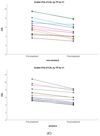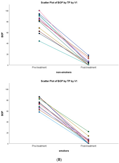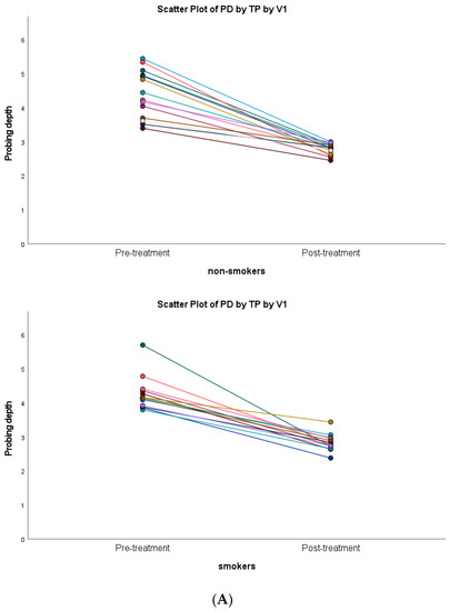Both non-smoker and smoker subjects showed statistically significant decreases in terms of inflammatory clinical parameters (p < 0.001). A similar clinical healing pattern was observed in both groups (Figure 3).