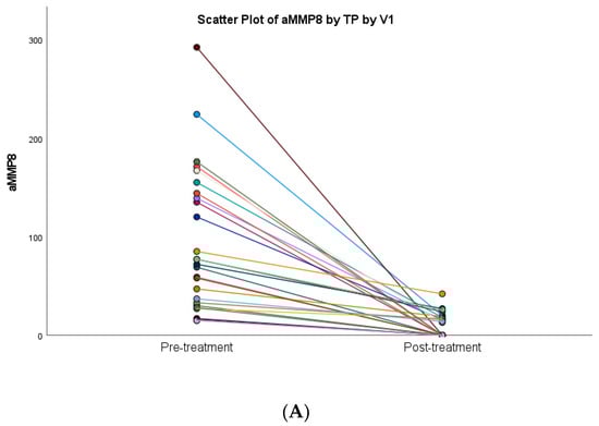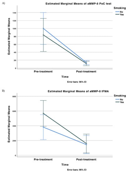 Differences in the mean levels of diagnostic marker aMMP-8 (Oralyzer®), IFMA aMMP-8: Pretreatment—baseline; Post-treatment—1 month following anti-infective periodontal treatment. (A) Estimated Marginal Means of aMMP-8 PoC test; (B) Estimated Marginal Means of aMMP-8 IFMA.