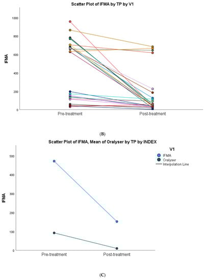 Scatter plot diagrams showing the effect of anti-infective periodontal treatment on aMMP-8 levels: (A) Oralyzer®’ (B) IFMA; (C) regression lines of means.