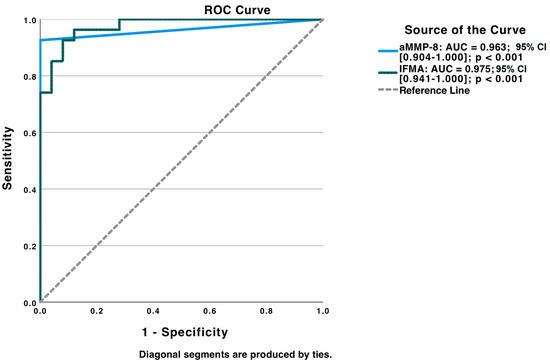AUC was also calculated and showed excellent discrimination ability between periodontitis and periodontally healthy groups (aMMP-8 POC test = 0.963; 95% CI: 0.904–1.000; p < 0.001 and aMMP-8 IFMA test = 0.975; 95% CI: 0.941–1.000; p < 0.001). Optimal cut-offs for aMMP-8 POC and IFMA tests were estimated by Youden’s Index (aMMP-8 POC test: 20.0 ng/mL; sensitivity: 0.852; specificity: 1.000; aMMP-8 IFMA test: 43.20 ng/mL; sensitivity: 0.926; specificity: 0.920).