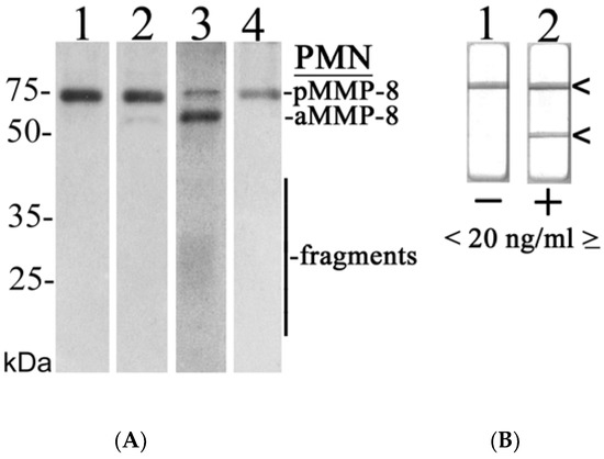 Representative Western immunoblot for molecular forms and species of MMP-8/collagenase-2 in the studied mouth rinse samples: (A) Lane 1: recombinant human MMP-8 (100 ng), monoclonal antibody; Lane 2: mouth rinse sample of systemically and orally healthy subject, monoclonal antibody; Lane 3: mouth rinse sample of systemically and orally/periodontally diseased subject before anti-infective treatment, monoclonal antibody; Lane 4: mouth rinse sample of systemically and orally diseased subject after anti-infective treatment; PMN indicates polymorphonuclear leukocyte; pMMP-8 indicates latent proMMP-8; aMMP-8 indicates active MMP-8; fragments indicate lower (<50 kDa) molecular size MMP-8 species due the activation and related fragmentation; (B) negative (−, one line, <20 ng/mL aMMP-8, Lane 1) and positive (+, two lines, ≥20 ng/mL aMMP-8, Lane 2) chairside (PoC) lateral-flow immunotest outcomes indicated by arrows on the right.