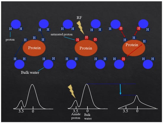 Mechanism of APT CEST imaging. The APT effect is measured as a reduction in bulk water intensity due to chemical exchange of water protons with labeled backbone amide protons at 3.5 ppm.