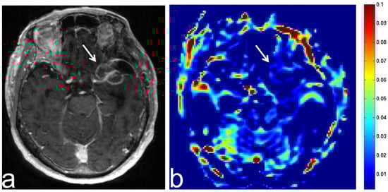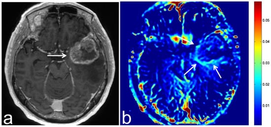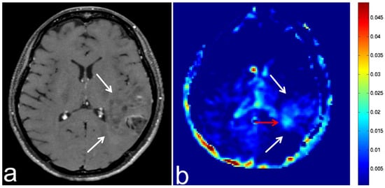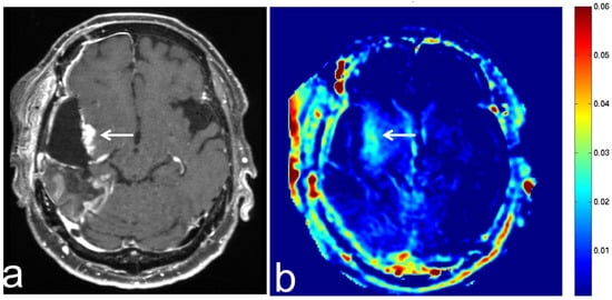 Images from a 72-year-old woman with a GBM after operation and radiotherapy. (a) Three-dimensional, contrast-enhanced, T1-weighted sequence shows enhancement at the marginal dead space of the surgical site in the right temporal lobe (white arrow). Local recurrence is suspected according to the clinical course. (b) APT-CEST sequence (axial section) shows relatively high SI consistent with the enhancement (white arrow).