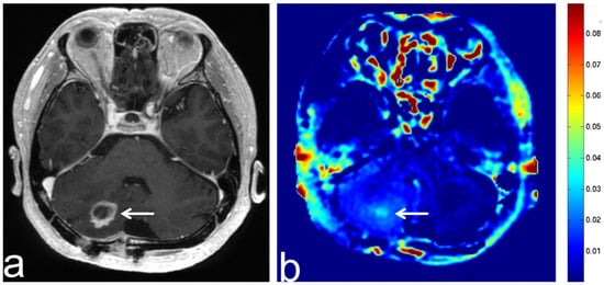 Images from a 70-year-old man with suspected radiation necrosis after operation and irradiation for brain metastasis from esophageal cancer. (a) Three-dimensional, contrast-enhanced, T1-weighted sequence shows multiple sparse enhancements in the left temporal lobe (white arrow). Radiation necrosis is suspected according to the clinical course. (b) APT-CEST sequence (axial section) shows low SI consistent with the enhancement in the left temporal lobe (white arrow).