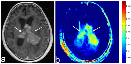 Images from a 68-year-old man with diffuse large B cell lymphoma. (a) Three-dimensional, contrast-enhanced, T1-weighted sequence shows an intense enhancement intraventricular mass (white arrow). (b) APT-CEST sequence (axial section) shows a high SI throughout the intraventricular malignant lymphoma (white arrow).