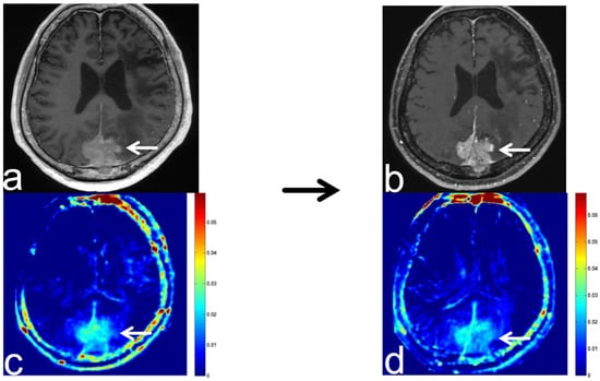 Images from a 64-year-old woman with an atypical meningioma before and after transcatheter arterial embolization (TAE). (a) Three-dimensional, contrast-enhanced, T1-weighted sequence shows atypical falcine meningioma involving superior sagittal sinus before TAE (white arrow). (b) Three-dimensional, contrast-enhanced, T1-weighted sequence shows atypical falcine meningioma involving superior sagittal sinus after TAE (white arrow). There was no apparent change in the atypical meningioma compared with pre-TAE imaging. (c) APT-CEST sequence (axial section) shows high SI consistent with meningioma before TAE (white arrow). (d) APT-CEST sequence (axial section) shows a decrease in SI in the left side of the atypical meningioma after TAE (white arrow). However, color bar and range for (c,d) were slightly different.