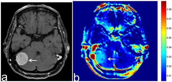 Meningioma is the most frequently diagnosed primary brain tumor in adults [29,30]. Meningiomas are categorized into three WHO grades with 15 histological subtypes, indicating heterogenous clinical and molecular genetic characteristics [31]. As most meningiomas are benign and categorized as WHO Grade I with a slow-growing behavior, most require no immediate treatment. However, some subtypes corresponding to WHO grades II and III are associated with a higher risk of recurrence and shorter survival times. One study investigated the feasibility of APT-CEST imaging for differentiating benign from atypical meningiomas [32] (Figure 8), while another study investigated the feasibility of APT-CEST imaging for differentiating growing meningiomas from non-growing meningiomas [33] (Figure 9, Figure 10 and Figure 11).