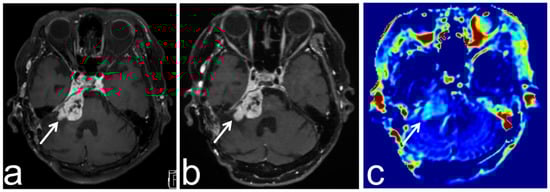 Images from a 67-year-old woman with a growing meningioma post operation. (a,b) Three-dimensional, contrast-enhanced, T1-weighted sequence shows partially increasing cerebellopontine angle meningioma (white arrow). (c) APT-CEST sequence (axial section) shows relatively high SI consistent with the increasing part of the tumor (white arrow).