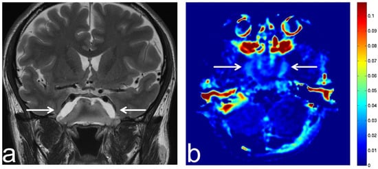 Images from a 38-year-old man with sphenoid sinus mucocele. (a) T2-weighted sequence (coronal section) shows a sphenoid sinus mucocele (white arrow). (b) APT-CEST sequence (axial section) shows low SI consistent with sphenoid sinus mucocele (white arrow).