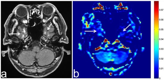 Paranasal sinus mucocele is defined as the accumulation and retention of mucoid secretion within the sinus, leading to the thinning, distension, and erosion of its bony walls. Sphenoid sinus mucocele is pathologically benign and comprises 1–2% of all paranasal sinus mucoceles [36]. To the best of our knowledge, there are no reports of APT-CEST imaging of sphenoid sinus mucocele. However, this lesion is not a tumor, and a low APT SI is expected. In our case, sphenoid sinus mucocele showed a low APT SI (Figure 12).