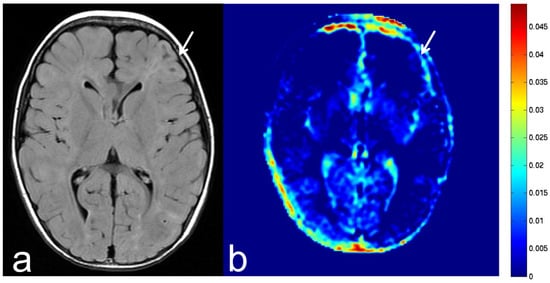 Images from a 4-year-old girl with tuberous sclerosis complex. (a) FLAIR sequence (axial section) shows slightly high SI in the left frontal lobe (white arrow). This lesion was suspected to be a cortical hamartoma. (b) APT-CEST sequence (axial section) shows low SI consistent with suspected cortical hamartoma (white arrow).