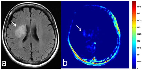 Images from a 43-year-old woman under treatment with an immunosuppressant drug for systemic lupus erythematosus who presented with progressive multifocal leukoencephalopathy (PML). (a) FLAIR sequence (axial section) shows PML with high SI in the right cerebral hemisphere (white arrow). (b) APT-CEST sequence (axial section) shows low SI consistent with PML (white arrow).