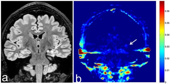 Images from a 36-year-old woman with hippocampal sclerosis. (a) FLAIR sequence (coronal section) shows left hippocampal sclerosis with high SI (white arrow). (b) APT-CEST sequence (coronal section) shows low SI consistent with hippocampal sclerosis (white arrow). There is no difference between the left and right hippocampal SI.