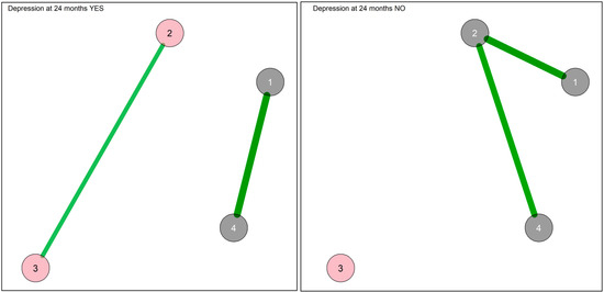 Network of symptoms with Bayesian estimation and walktrap community detection in the subgroups with and without MDE at 24 months. 1: Depression; 2: Somatic; 3: Agitation; 4: Anxiety. Each node corresponds to a symptom cluster identified in the previous symptom reduction. Nodes are connected with lines (edges) that represent the strength of association between nodes. Green edges suggest a positive association, whereas red edges suggest a negative association. The thickness of the edge represents the edge’s weight, which is an indication of the strength of the association. The thicker the edge, the greater the weight and the stronger the association. In this network, all edges connecting the nodes are green (positive correlation), with their width indicating the strength of their connections. Node colors indicate the community of the nodes. In the MDE YES network: pink for agitation and somatic symptoms and grey for depression and anxiety. In the MDE NO network: pink for agitation and grey for depression, anxiety and somatic symptoms.