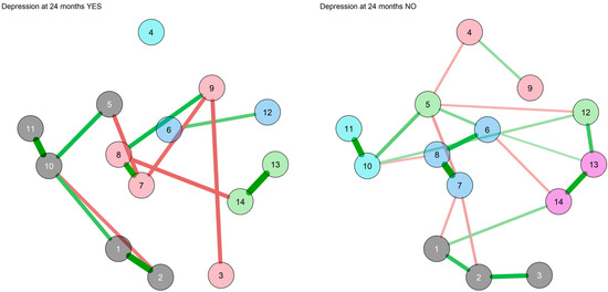 Network of trait measures with Bayesian estimation and walktrap community detection in the subgroups with and without MDE at 24 months. 1: TAS-20 Difficulty identifying feelings; 2: TAS-20 Difficulty describing feelings; 3: TAS-20 Externally oriented thinking; 4: TCI Novelty-seeking; 5: TCI Harm avoidance; 6: TCI Reward dependence; 7: TCI Self-directedness; 8: TCI Cooperativeness; 9: TCI Self-transcendence; 10: DS-14 Negative affectivity; 11: DS-14 Social inhibition; 12: DSQ-40 Mature defenses; 13: DSQ-40 Neurotic defenses; 14: DSQ-40 Immature defenses. Each node corresponds to a symptom cluster identified in the previous symptom reduction. Nodes are connected with lines (edges) that represent the strength of association between nodes. Green edges suggest a positive association, whereas red edges suggest a negative association. The thickness of the edge represents the edge’s weight, which is an indication of the strength of the association. The thicker the edge, the greater the weight and the stronger the association. In this network, all edges connecting the nodes are green (positive correlation), with their width indicating the strength of their connections. Node colors indicate the community of the nodes. In the MDE YES network: grey for inhibition, green for immature defenses, pink for TCI Characters, light blue for reward dependence and mature defenses and aquamarine for novelty-seeking. In the MDE NO network: pink for novelty-seeking and self-transcendence, grey for the TAS, green for harm avoidance and mature defenses, purple for immature defenses, light blue for TCI Reward dependence and characters and aquamarine for DS-14.