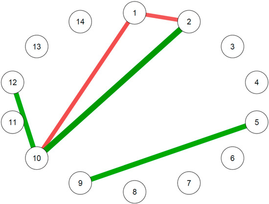 Differences of personality networks between those with and without MDE at follow-up. 1: TAS-20 Difficulty identifying feelings; 2: TAS-20 Difficulty describing feelings; 3: TAS-20 Externally oriented thinking; 4: TCI Novelty-seeking; 5: TCI Harm avoidance; 6: TCI Reward dependence; 7: TCI Self-directedness; 8: TCI Cooperativeness; 9: TCI Self-transcendence; 10: DS-14 Negative affectivity; 11: DS-14 Social inhibition; 12: DSQ-40 Mature defenses; 13: DSQ-40 Neurotic defenses; 14: DSQ-40 Immature defenses. Each node corresponds to a trait-like feature. The edges connecting the nodes indicate the main edge differences between the network of those with MDE and those without MDE, with green edges indicating positive differences and red edges indicating negative differences.