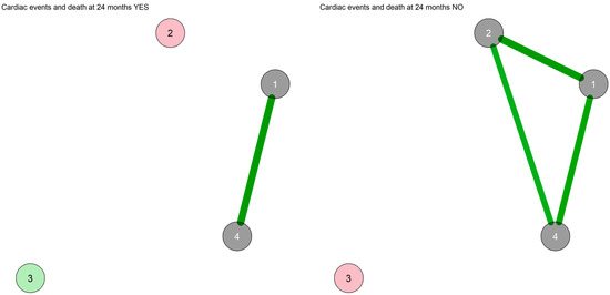 Network of symptoms with Bayesian estimation and walktrap community detection in the subgroups with and without MACE at 24 months. 1: Depression; 2: Somatic; 3: Agitation; 4: Anxiety. Each node corresponds to a symptom cluster identified in the previous symptom reduction. Nodes are connected with lines (edges) that represent the strengths of associations between nodes. Green edges suggest positive associations, whereas red edges suggest negative associations. The thickness of the edge represents the edge’s weight, which is an indication of the strength of the association. The thicker the edge, the greater the weight and the stronger the association. In this network, all edges connecting the nodes are green (positive correlation), and their widths indicate the strength of their connections. Node colors indicate the community of the nodes. In the MACE YES network, three communities were identified: somatic symptoms, depression and anxiety, and agitation. In the MACE NO network, two communities were identified: pink for agitation, and grey for somatic symptoms, depression and anxiety. All edges connecting the nodes are green (positive correlation), and their widths indicate the strength of their connections.