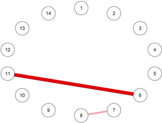 Graphical representation of edge differences in the trait-like features network with Bayesian estimation between those with and without MACE at follow-up. 1: TAS-20 Difficulty identifying feelings; 2: TAS-20 Difficulty describing feelings; 3: TAS-20 Externally oriented thinking; 4: TCI Novelty-seeking; 5: TCI Harm avoidance; 6: TCI Reward dependence; 7: TCI Self-directedness; 8: TCI Cooperativeness; 9: TCI Self-transcendence; 10: DS-14 Negative affectivity; 11: DS-14 Social inhibition; 12: DSQ-40 Mature defenses; 13: DSQ-40 Neurotic defenses; 14: DSQ-40 Immature defenses. Each node corresponds to a trait-like feature. The edges connecting the nodes indicate the main edge differences between the network of those with MACE and those without MACE. All edges are red, indicating negative differences.