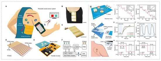 A microfluidic based wireless battery free sweat sensor (A). Freestanding-mode TENG (FTENG) wearable sweat sensor system (FWS3) for real time sweat biosensing; (B,C). Images of the sensor worn on side torso of human; (D). Flow chart of flexible printed circuit board based FTENG with a grating slider and an interdigital stator; (E). Microfluidic-based sweat analysis patch interfacing with the flexible circuitry; (F). Working process of the sensor; (G). Flexible biosensor array comprising a pH sensor and a Na+ sensor patterned on a flexible PET substrate and their calibration plots. (Reprinted from [34] which is an open access article distributed under the Creative Commons Attribution License).