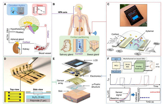 Wearable aptamer field effect transistor (FET) sensor for cortisol monitoring in sweat. (A). The control of level of cortisol in response to stress and circadian rhythm by hypothalamus-pituitary-adrenal axis; (B). Salivary and sweat glands excrete a portion of cortisol that is not bound to blood plasma proteins; (C). Analysis of saliva and sweat samples by the FET sensor; (D). Fabrication of the FET sensor with In2O3 semiconductor channels on a polyimide substrate; (E). Depiction of the components of the aptamer FET sensor smartwatch; (F). Summary of the FET sensor signal acquisition and data processing via source measurement unit (SMU) and microcontroller unit (MCU), display, and transmission (IDS-source-drain current; VGS-gate voltage) (Reprinted from [95] which is an open access article distributed under the Creative Commons Attribution License).