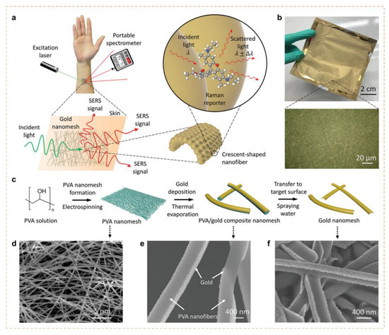 Design, characterisation and fabrication of wearable SERS sensor for detection of sweat biomarkers (a). Scheme representing the design and idea of wearable SERS sensor on skin; (b). Image of the gold nanomesh fabricated. Inset depicts the optical microscopy image of the gold nanomesh (50X); (c). Scheme representing the development procedure of nanomesh by electrospinning and further treatment process of the gold nanomesh; SEM micrograph of the (d). PVA fiber nanomesh; (e). Gold coated PVA fiber nanomesh; (f). Gold nanomesh after eliminating the PVA fibers. (Reprinted from [109] which is an open access article distributed under the Creative Commons Attribution License).