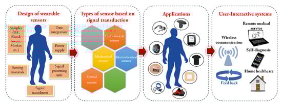 The basic requirement for the fabrication of wearable sensors includes stretchable, mechanically flexible, biodegradable and should adapt with the movement of human body. Poly (vinyl alcohol), poly(dimethylsiloxane) (PDMS), Ecoflex, polyurethane (PU), poly (ethylene terephthalate) (PET), polyester etc are some of the materials that are commonly used as sensor materials [17,18]. Similarly, several nanomaterials (organic, inorganic or hybrid) are also widely used as sensing materials [8]. Further, based on the type of sensor, the property of the material used also varies. For example, in case of sensors implanted in the body, biocompatible and biodegradable materials are used.
