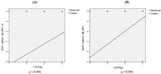 - Baron, C.; Henry, M.; Tamalet, C.; Villeret, J.; Richet, H.; Carcopino, X. Relationship Between HPV 16, 18, 31, 33, 45 DNA Detection and Quantitation and E6/E7 MRNA Detection Among a Series of Cervical Specimens With Various Degrees of Histological Lesions. J. Med. Virol. 2015, 87, 1389–1396. [Google Scholar] [CrossRef]