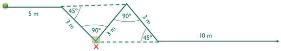 CODAT test diagram. The initial point of the test is drawn with a green ball. The green square shows the location of the force plate. The red cross identifies the change-of-direction task that was recorded with the 3D motion capture system.