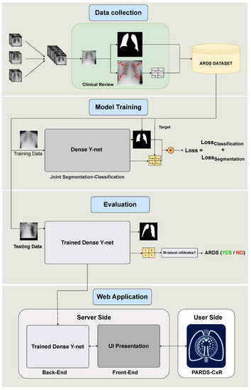 This study contains four main phases, as illustrated in Figure 1. The end product is PARDS-CxR, the web-based application to detect ARDS. First, a substantial set of data is required to train the model. Existing public datasets do not include ARDS-labeled CXR images, so we created a new one. This data collection process is summarized in Section 2.2. Then, the proposed model must be trained on the CXR images. The model has two outputs associated with lung segmentation and ARDS classification, as explained in Section 2.3. The trained model is then tested on unseen data to be evaluated. Section 2.4, Section 2.5 and Section 2.6 detail the validation process. Finally, the model is uploaded to a server, and an interface is designed so the user can easily access it. The web application is addressed in Section 2.7.