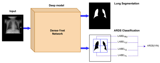 The Dense-Ynet model takes advantage of the interaction between the segmentation and classification tasks by performing them simultaneously. The features from the original and lung-segmented images are concatenated and utilized to classify ARDS cases.