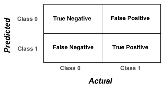 The elements of the confusion matrix, namely, the true positive (TP), true negative (TN), false positive (FP), and false negative (FN) values, serve to calculate several assessment metrics as follows: