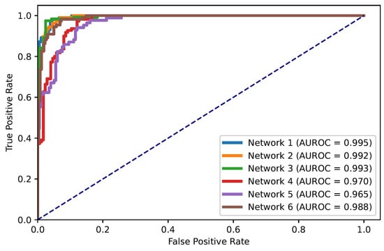 The receiver operating characteristic (ROC) curve illustrates the diagnostic capacity of a system by comparing true positive and false positive rates as the discrimination threshold (applied at the network’s output layer to decide between the two classes) varies. The area under the ROC curve (AUROC) represents the discriminatory power of the classifier.