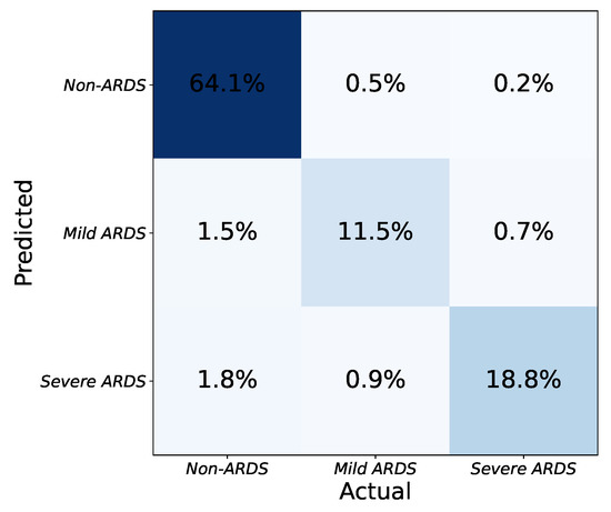 As seen in Table 2, the application determines the severity of ARDS in CXR images based on the number and combination of affected lung quadrants. The platform provides a global score for each input image by taking the average of the scores from each model. CXR images are then categorized into one of three severity grades based on the predicted scores: non-ARDS, mild ARDS, and severe ARDS. The platform’s effectiveness in determining ARDS severity is illustrated in Figure 6. The three-class confusion matrix shows that the approach can detect ARDS and discriminate between mild and severe states of the syndrome.