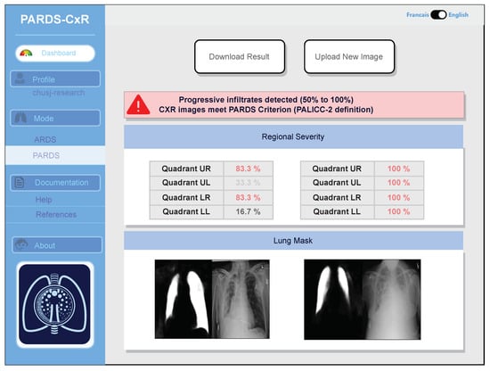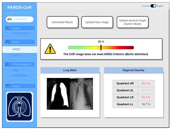 The application bases itself on the most accepted definitions for ARDS and PARDS. Based on the Berlin definition, the presence of bilateral infiltrates in chest radiography is a criterion manifesting the existence of ARDS [1]. The platform processes the image and displays its decision by providing a percentage associated with the level of infiltration in each quadrant (Figure 7). A global percentage is also given based on infiltrate levels of infiltrates in quadrants and their combination as in Table 2. This value represents the severity of ARDS in the input image. An image with a global percentage above is interpreted as an ARDS case, since, based on the proposed severity scoring system, infiltrates should be diffused through both lungs. Reporting each quadrant’s involvement is necessary, since it gives the rationale behind the global severity measure. As seen in Figure 7, a segmentation map highlighting the lung segments is also provided.