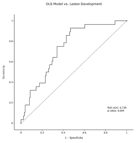 OLS ROC Curve. Receiver operating characteristic (ROC) curve in patients (n = 22) for the prediction of pancreas cancer development using the following baseline SSF2 radiomic features (mean, skewness, kurtosis mean split, and total pancreas fat %). This model was statistically significant with an Area Under the Curve (AUC) = 0.7392, p-value = 0.004.
