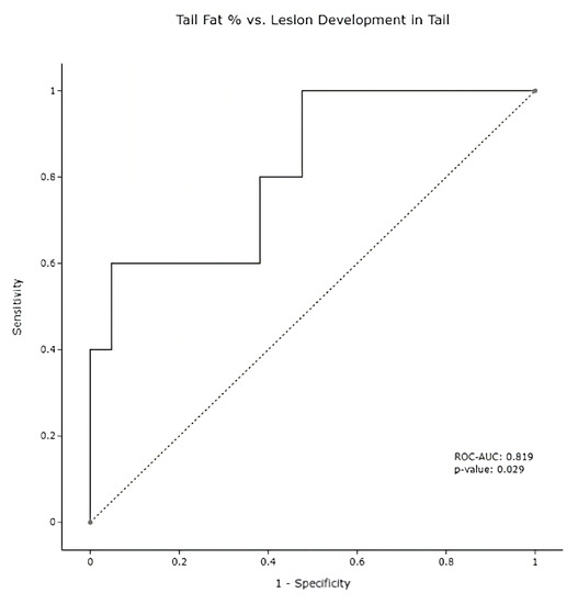 Pancreas Tail ROC Curve. Tail pancreatic fat measurements in subjects (n = 26) using only the pancreatic tail fat percentage as a feature; a classifier with an ROC-AUC of 0.819 was noted (p = 0.029).