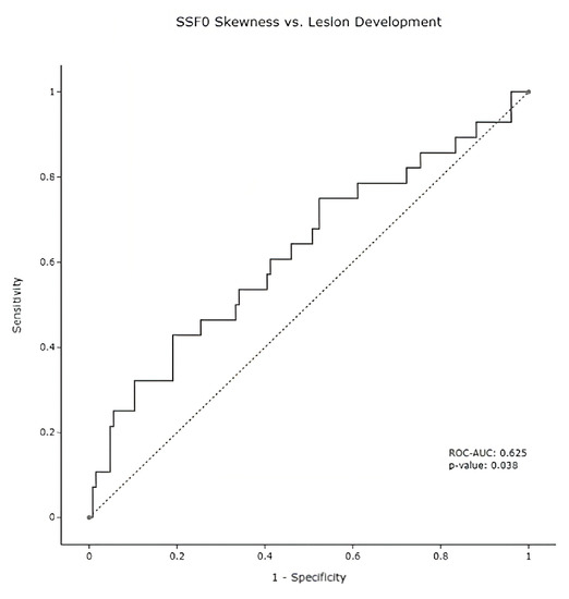 Lesion Skewness ROC Curve. Overall, SSF0 skewness was measurable on 154 pancreatic regions. Skewness measurements at baseline timepoints achieved a 0.625 ROC-AUC when discriminating for future lesion development, with a statistical significance of 0.038.