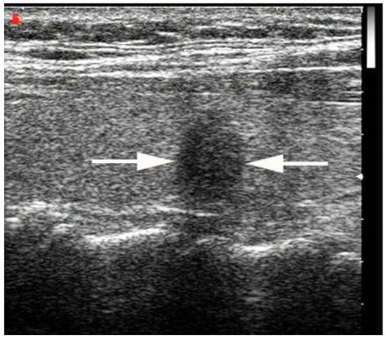 A 48-year-old woman with a PTMC with a taller-than-wide shape in the left thyroid lobe without suspicious thyroid capsule involvement sign (arrows). The patient underwent left central neck lymph node dissection, and the surgical–histopathologic results showed the absence of central neck lymph node metastases. PTMC: papillary thyroid microcarcinoma.
