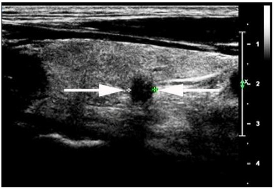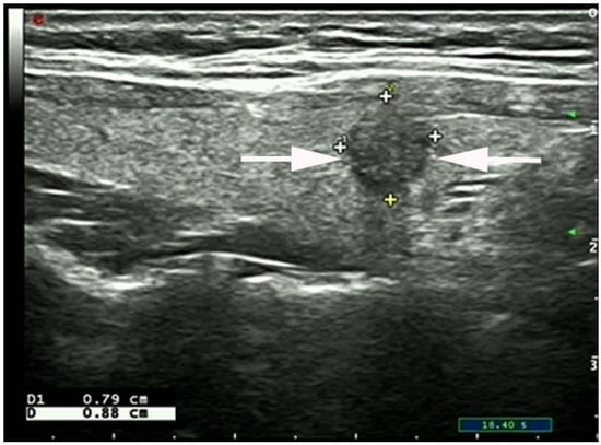- Frates, M.C.; Parziale, M.P.; Alexander, E.K.; Barletta, J.A.; Benson, C.B. Role of Sonographic Characteristics of Thyroid Bed Lesions Identified Following Thyroidectomy in the Diagnosis or Exclusion of Recurrent Cancer. Radiology 2021, 299, 374–380. [Google Scholar] [CrossRef]